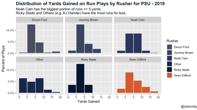 With all that being said, we can quickly see that Noah Cain (top right) is the most consistent in short-yardage situations, which is why so many fans love him. Quite simply, he gets first downs. Cain has the largest proportion of his runs that go for 5-10 yards. He doesn’t get many gains of larger than that, but he also doesn’t lose yards too often. While more explosive, both Brown, Ford, and Slade have a considerably larger portion of their runs going for less than 5 yards.