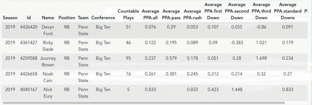 Success rate is factored into PPA (Predicted Points Added), the cousin of EPA. At a glance, justifying the majority opinion is the fact that Noah Cain leads the RB committee in PPA (Data is courtesy of CollegeFootballData.com, and you can see this data for yourself here).