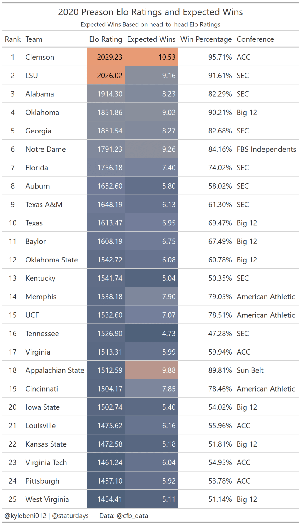We’ve updated our Elo Ratings since the last time we wrote about them. Specifically, we’ve recalculated the expected wins and win probabilities of all the teams based on their updated schedules. This resulted in lower overall win totals given the shortened season, but some teams have a higher win probability for the season as a result of the easier conference-only schedule (looking at you Notre Dame).