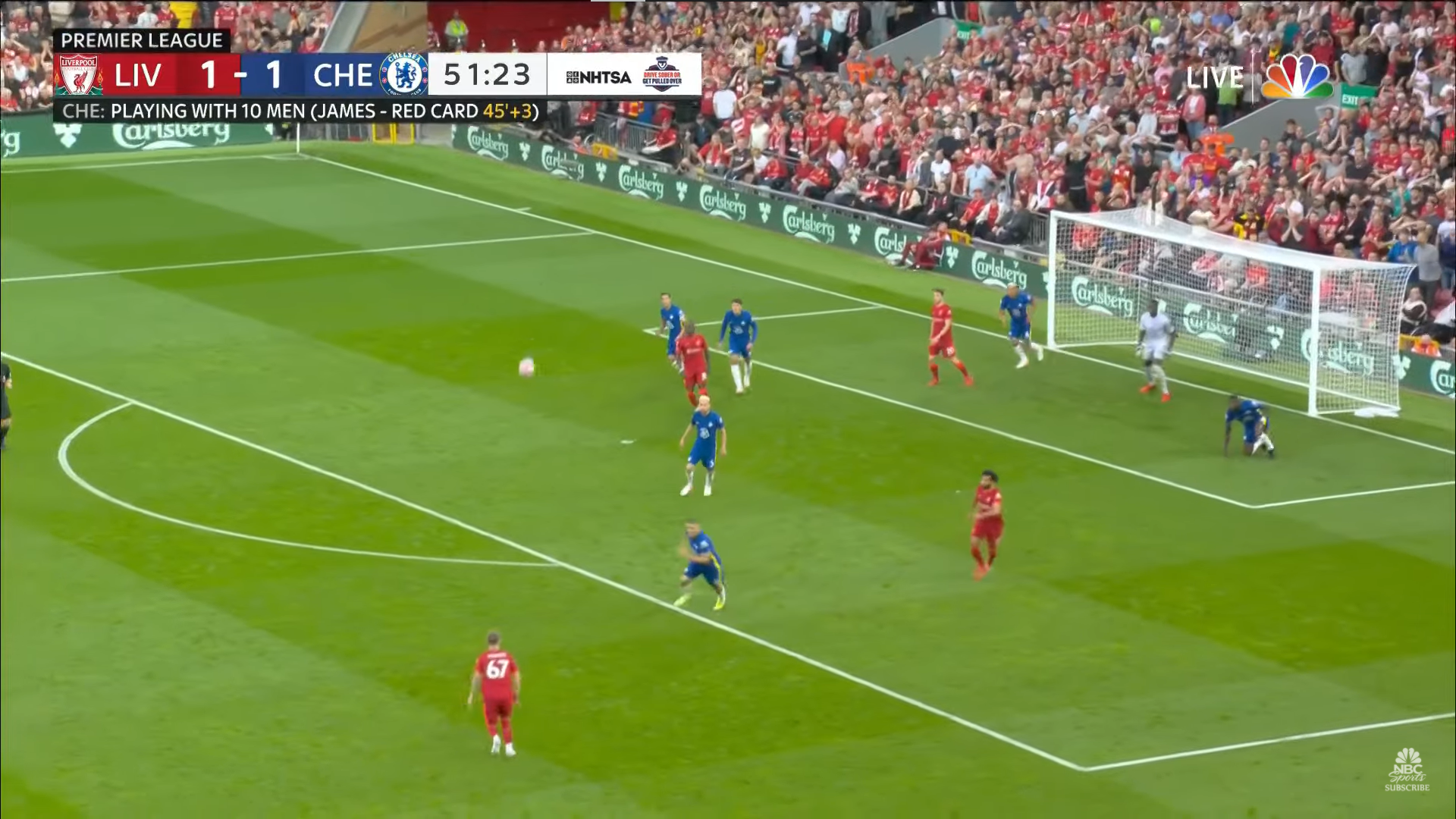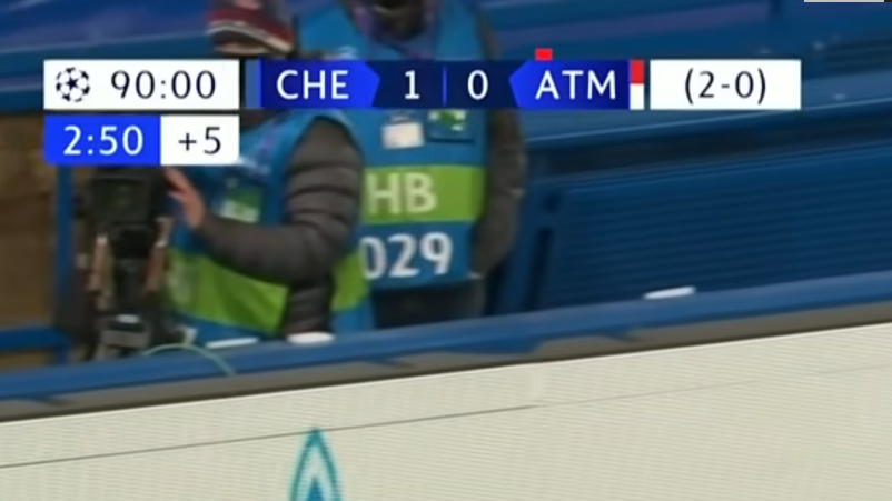 As I already stated, this is one of my favorite score bugs. Not only is it placed strategically to rarely cover up any of the action, but it is completely clean and elegant in its design and conveys a lot of information. The best part is that it changes dynamically with the game itself, as you can see above. When a player gets a red card, it lets you know who and when.