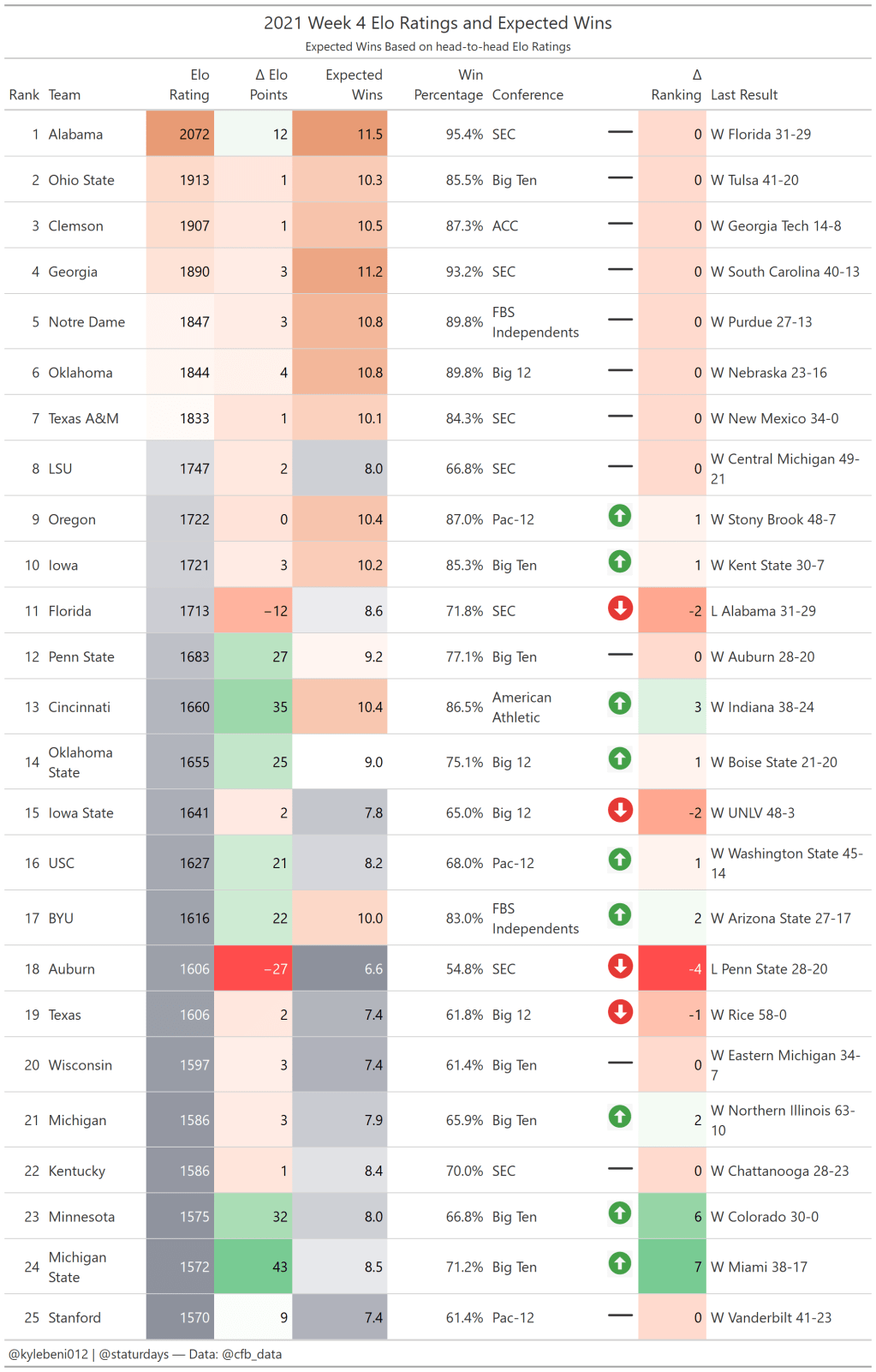 Here are the rankings for all FBS teams heading into Week 4 of the college football season, using our Elo rating system.