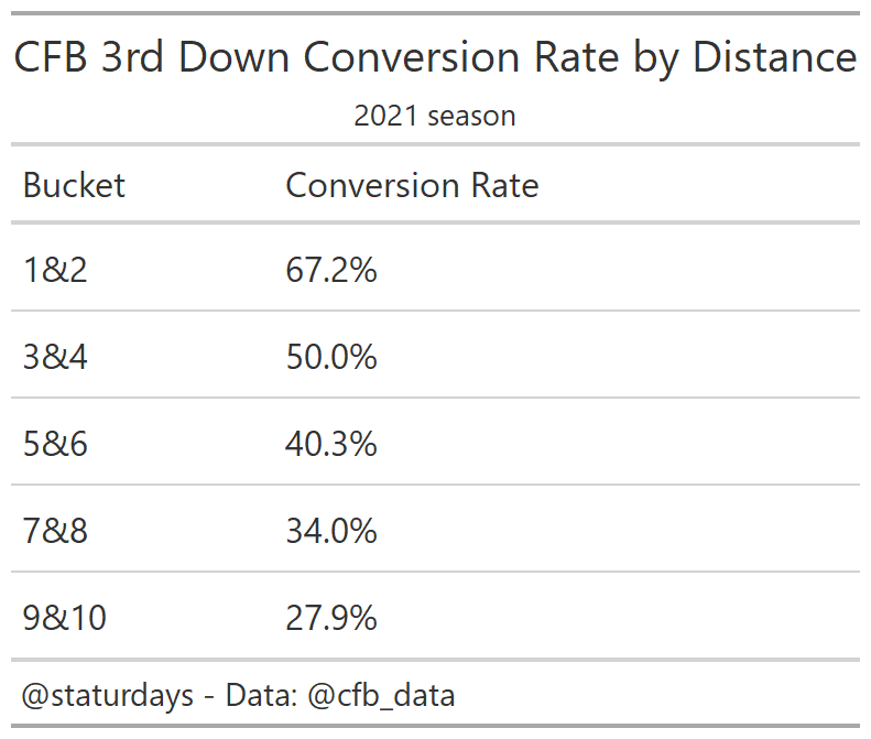 After the 2020 season, I wrote an article about third down conversion rates after adjusting for how many yards the team had to earn on that third down. The reason for this was because too often on broadcasts a team’s third down conversion rate is shown without any regard for how many yards the team has to earn on their current third down attempt. Fans, teams, and commentators know that a 3rd and 2 is more likely to be converted than a 3rd and 9, but they do not often differentiate between these two situations when talking about third down conversion rate. Luckily, that is what Staturdays is here for.