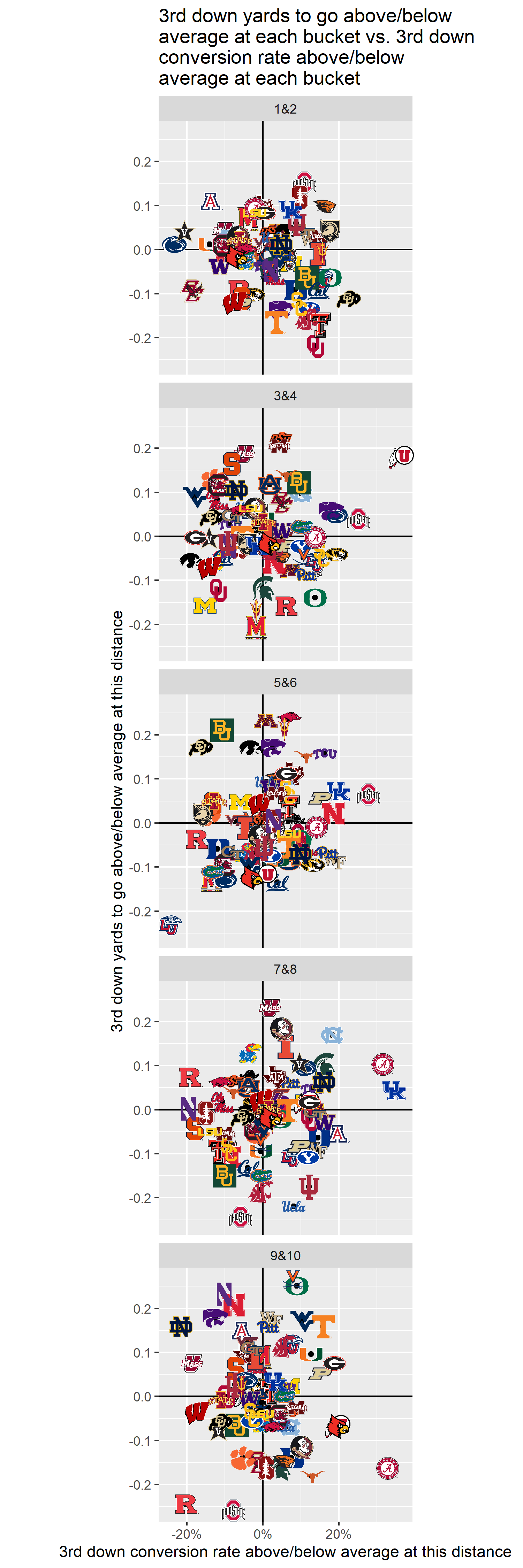 - The best team at any distance in the Power 5: Utah, converting 86% of third and 3&4’s (+36% from average). Other notable mentions include Alabama on third and 9&10 (+32%) and 7&8 (+31%) and Ohio State on third and 5&6 (+27%).