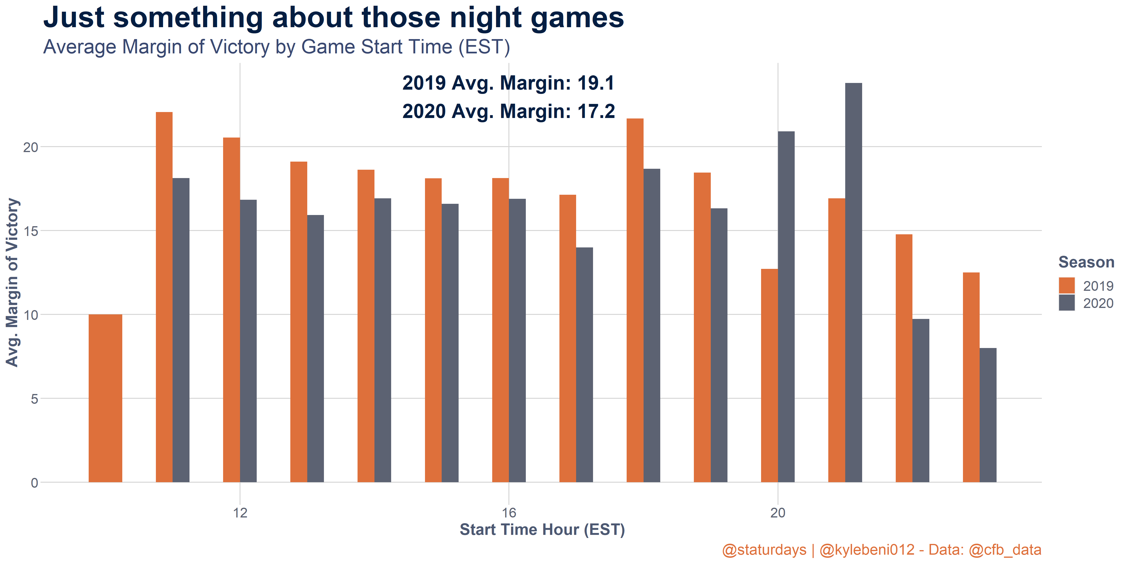 There were a lot of prime-time blowouts. It certainly felt that way, at least. But was it an unbalanced season? The actual margin of victory in 2020 was nearly 2 points less, at 17.2, than it was in 2019 at 19.1. But that could be due to the elimination of most blowout non-conference games. So when excluding non-conference games, 2020 still had a 0.5 point advantage over 2019 at 16.1 points. However, when you look at the start time of games, the 8-9 PM Eastern Time games (primetime) in 2020 had the largest margin of victory at 23.8 points. So we can agree that the primetime games sucked this year, but let’s not say the whole season was that way.