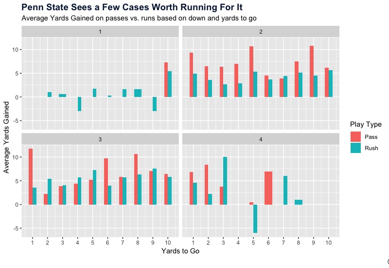 Penn State is a team that has slightly favored the run, and in some situations (like 3rd and short), you can’t really blame them. Penn State has had a lot of success on the ground in the past 3 seasons (partly due to one Saquon Barkley). As a result, they see a few more cases for the run than your average D-I team. Particularly, 3rd and short poses a good opportunity for a run-play, and somehow 4th and 3 is the best opportunity (once again, not 4th and 5 James). This is only on 2 data points for the run and 5 for the pass, so really too small a sample size to draw any conclusions from.