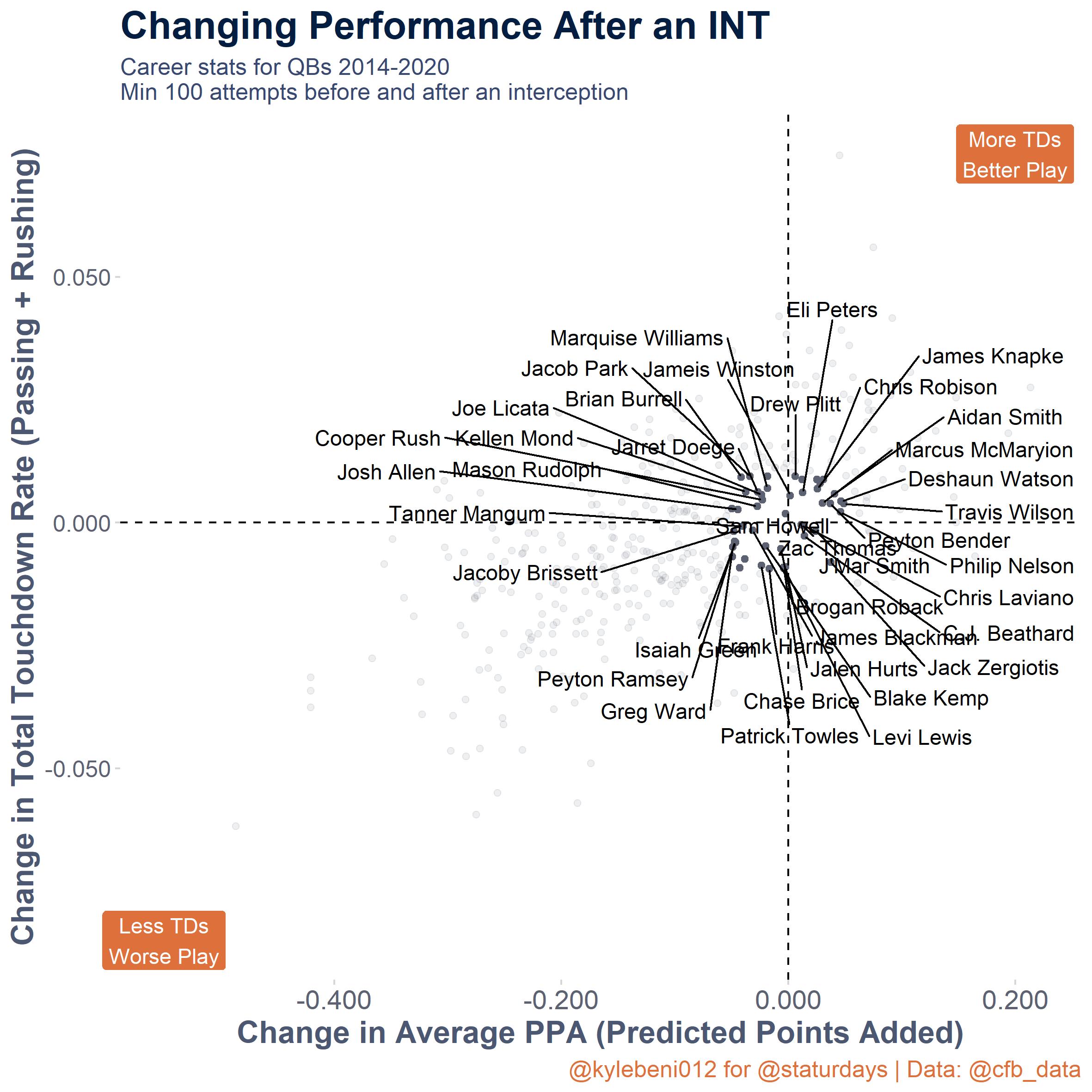 Basically, which QBs play better after throwing an interception—learning from their mistake—and which ones sink into a depression and lose all their swagger.
