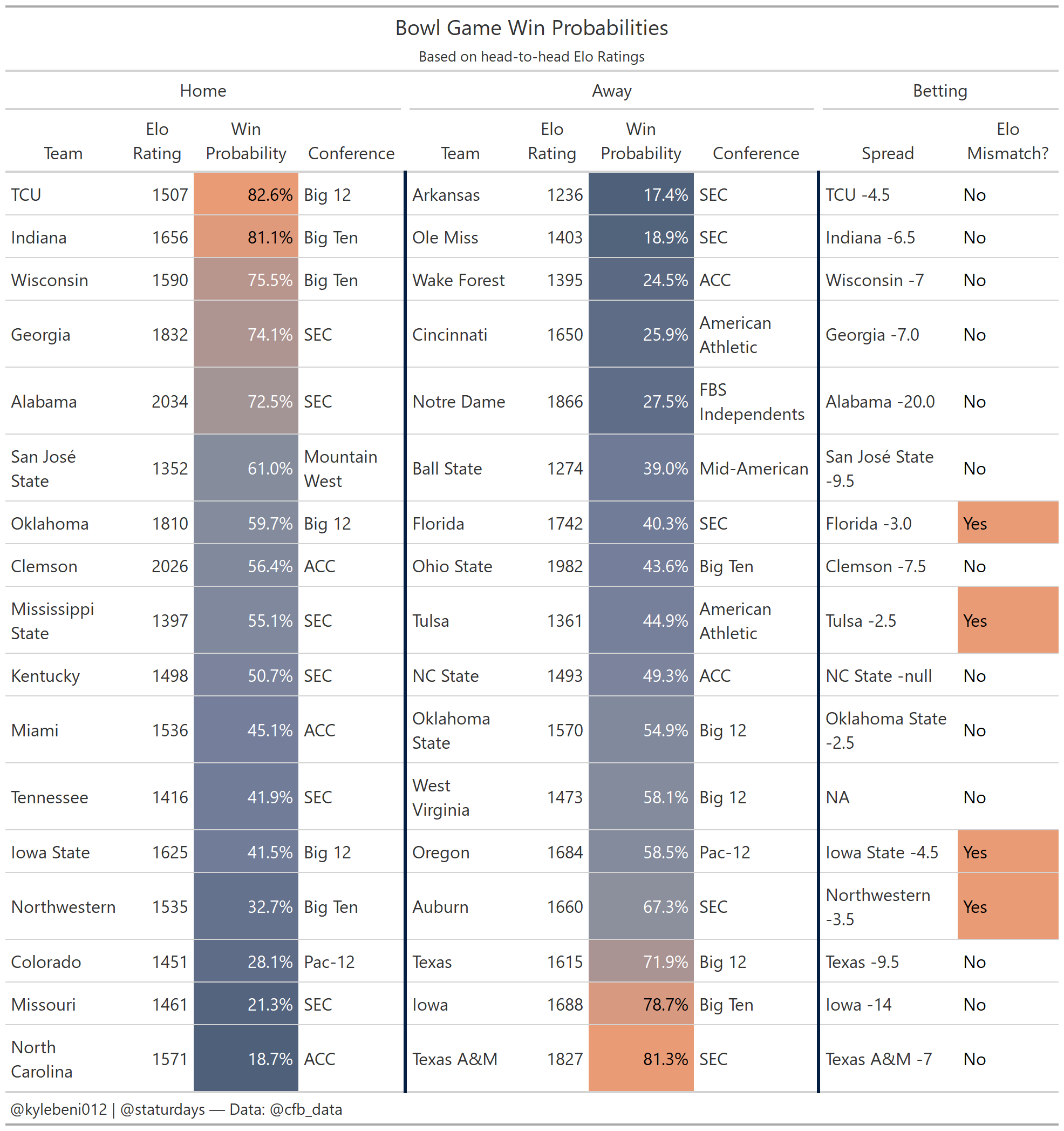 If you look at the data, it’s these boring teams that pay the best. Georgia Southern, Navy, Hawai’i: these are the teams that get the good-paying odds, and when they hit, it makes up for a lot of the misses and then some. These can also be the ones where you take both the moneyline and the spread, and you hedge if they lose but keep it closer than Vegas thought, or boost your profit if they win.