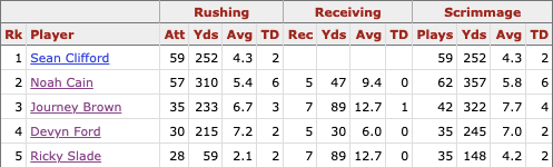 With all that being said, we can quickly see that Noah Cain (top right) is the most consistent in short-yardage situations, which is why so many fans love him. Quite simply, he gets first downs. Cain has the largest proportion of his runs that go for 5-10 yards. He doesn’t get many gains of larger than that, but he also doesn’t lose yards too often. While more explosive, both Brown, Ford, and Slade have a considerably larger portion of their runs going for less than 5 yards.