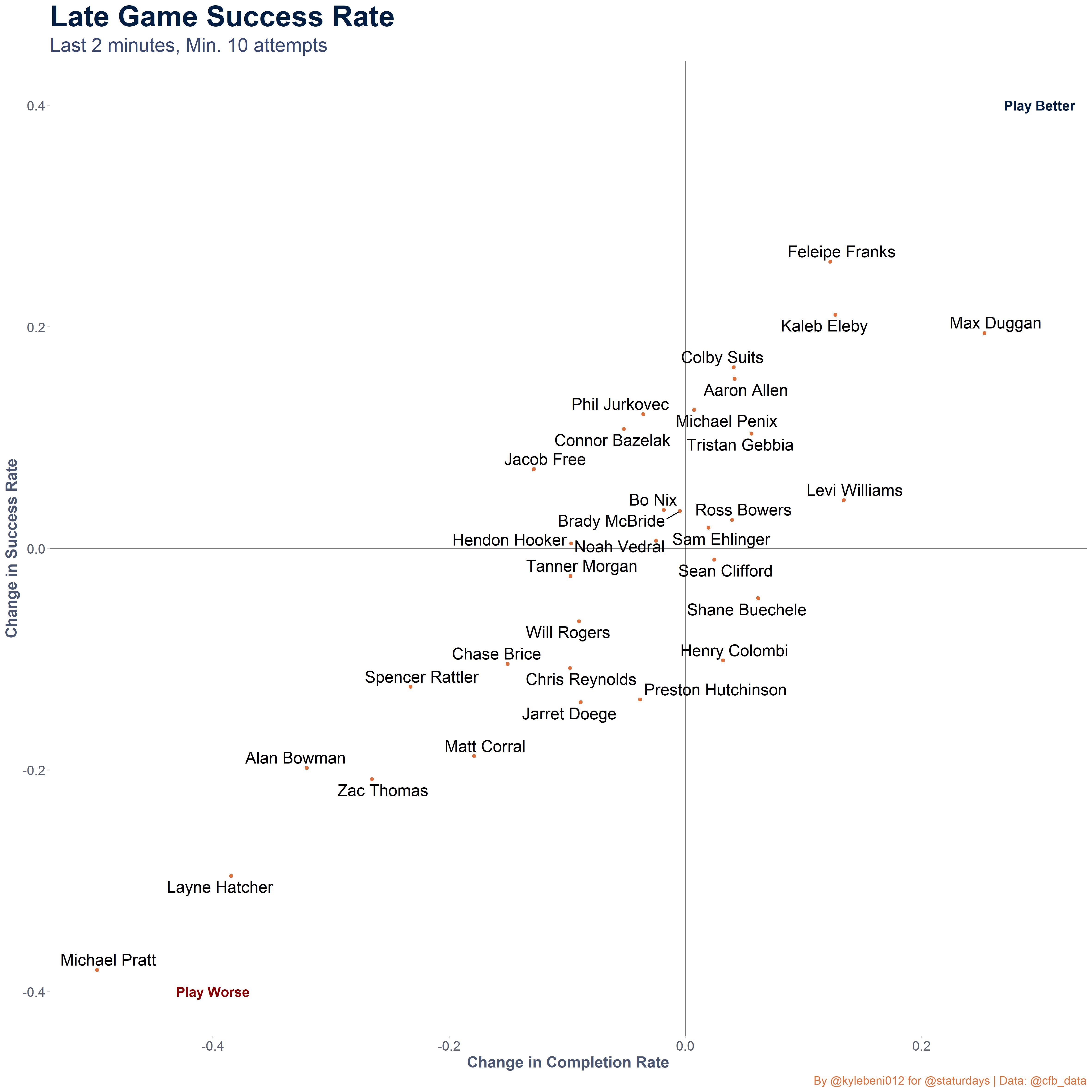 I looked at some basic QB stats like success rate, completion rate, and interception rate, and then broke them down based on some game situations like playing down, close games (10 or less point-differential), final two minutes, and quarter to see which players were the most and least consistent in different situations. My guess was that the best players in college football would either be the same or elevate their game in these situations.